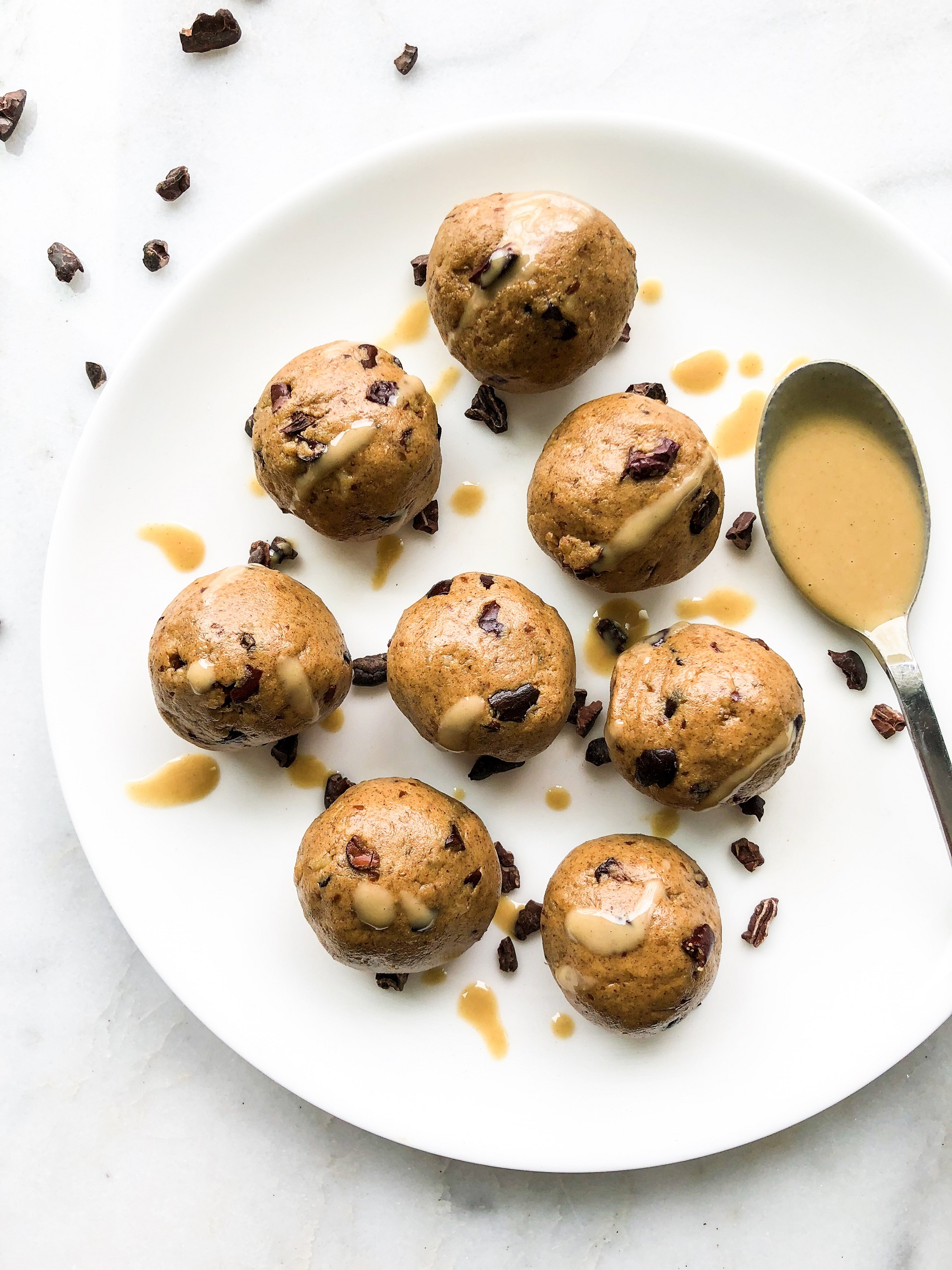 - In a bowl, mix protein powder, almond butter, tahini, coconut nectar, cacao nibs, and cinnamon.